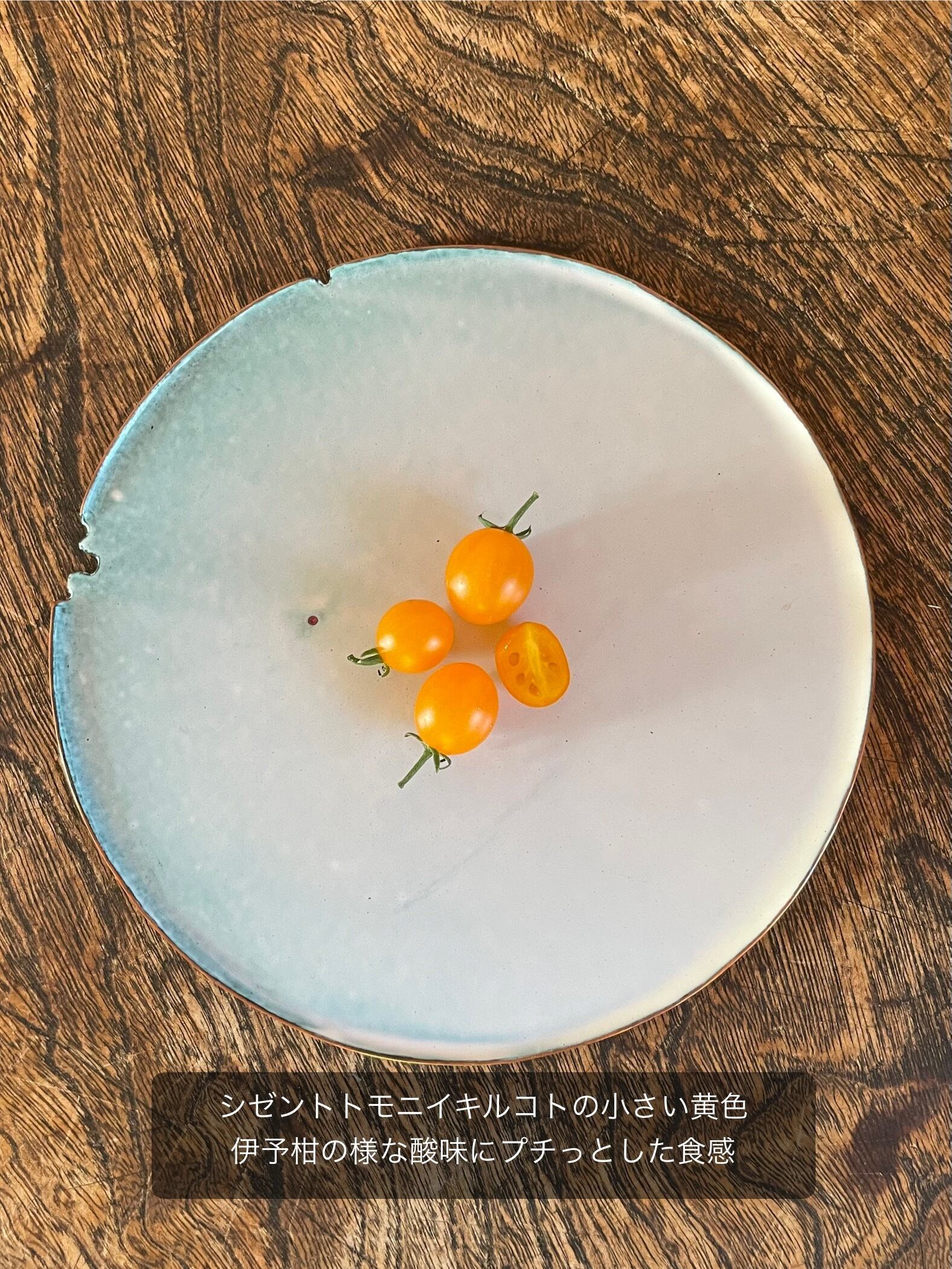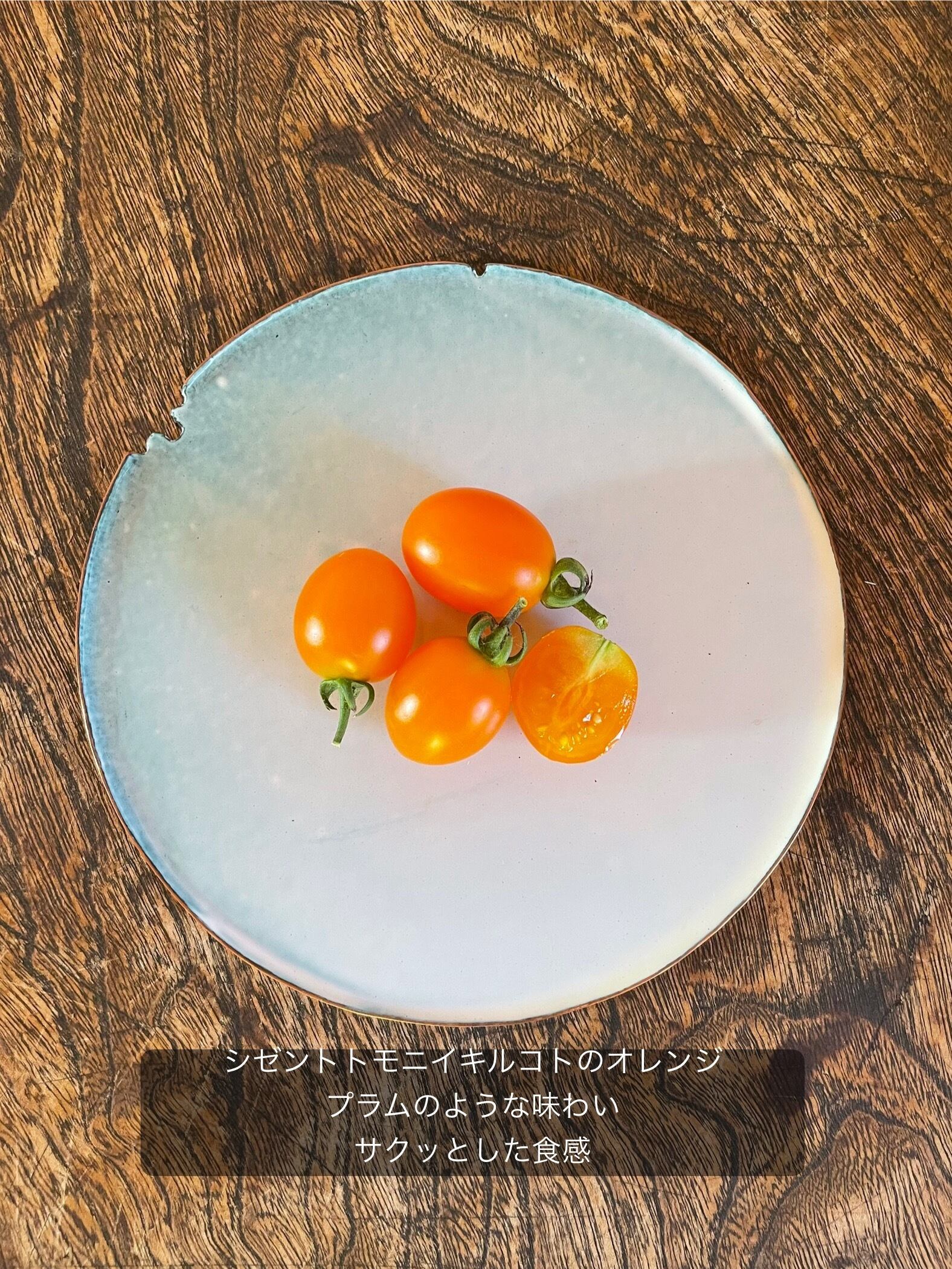 オレンジ:シゼントトモニイキルコトから頂いた実から自家採種しました。プラムのような味わいとサクッとした食感です。