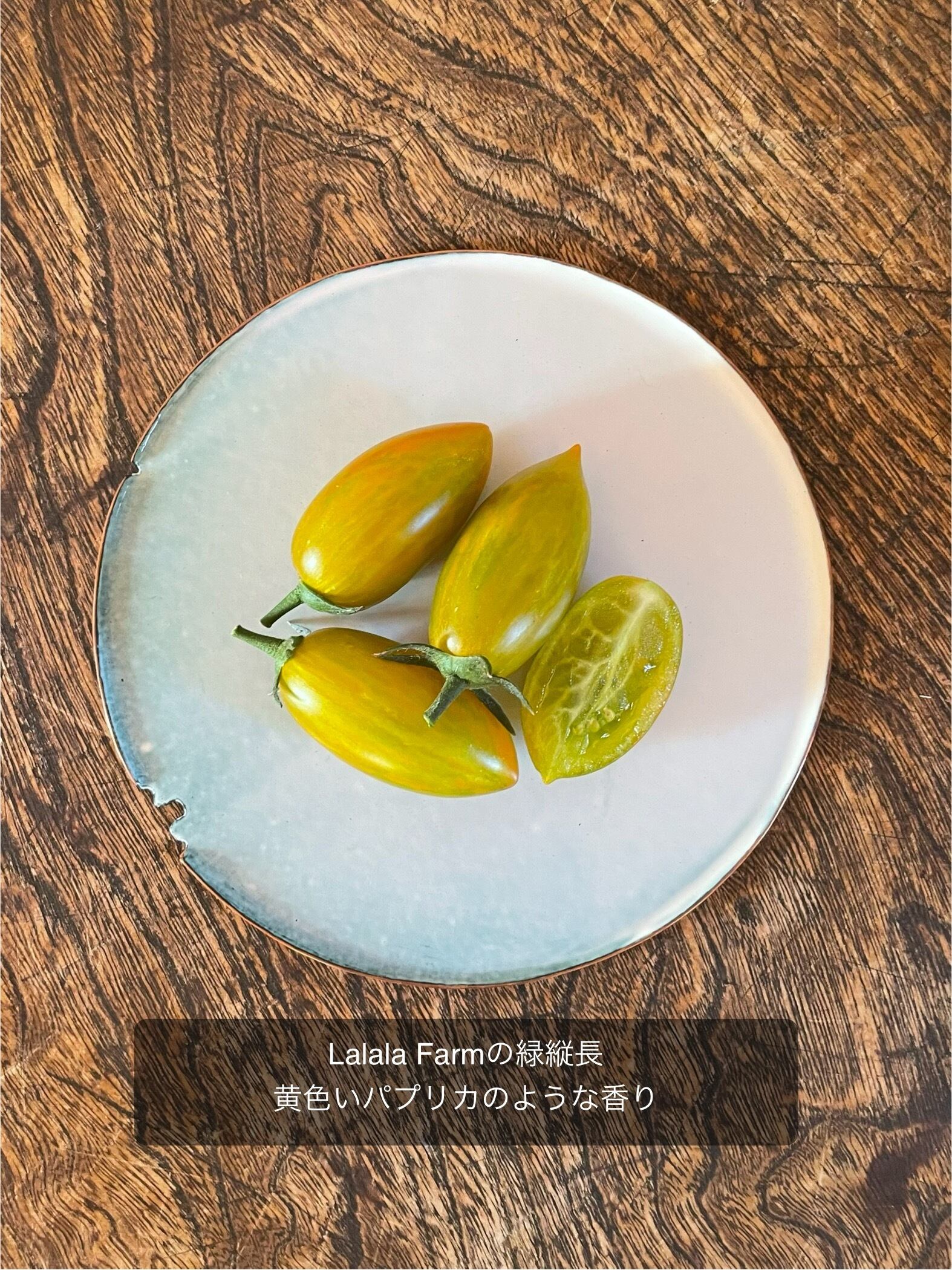 緑縦長:Lalala Farmから頂いた実から自家採種をしています。黄色いパプリカのような甘さと香りです。