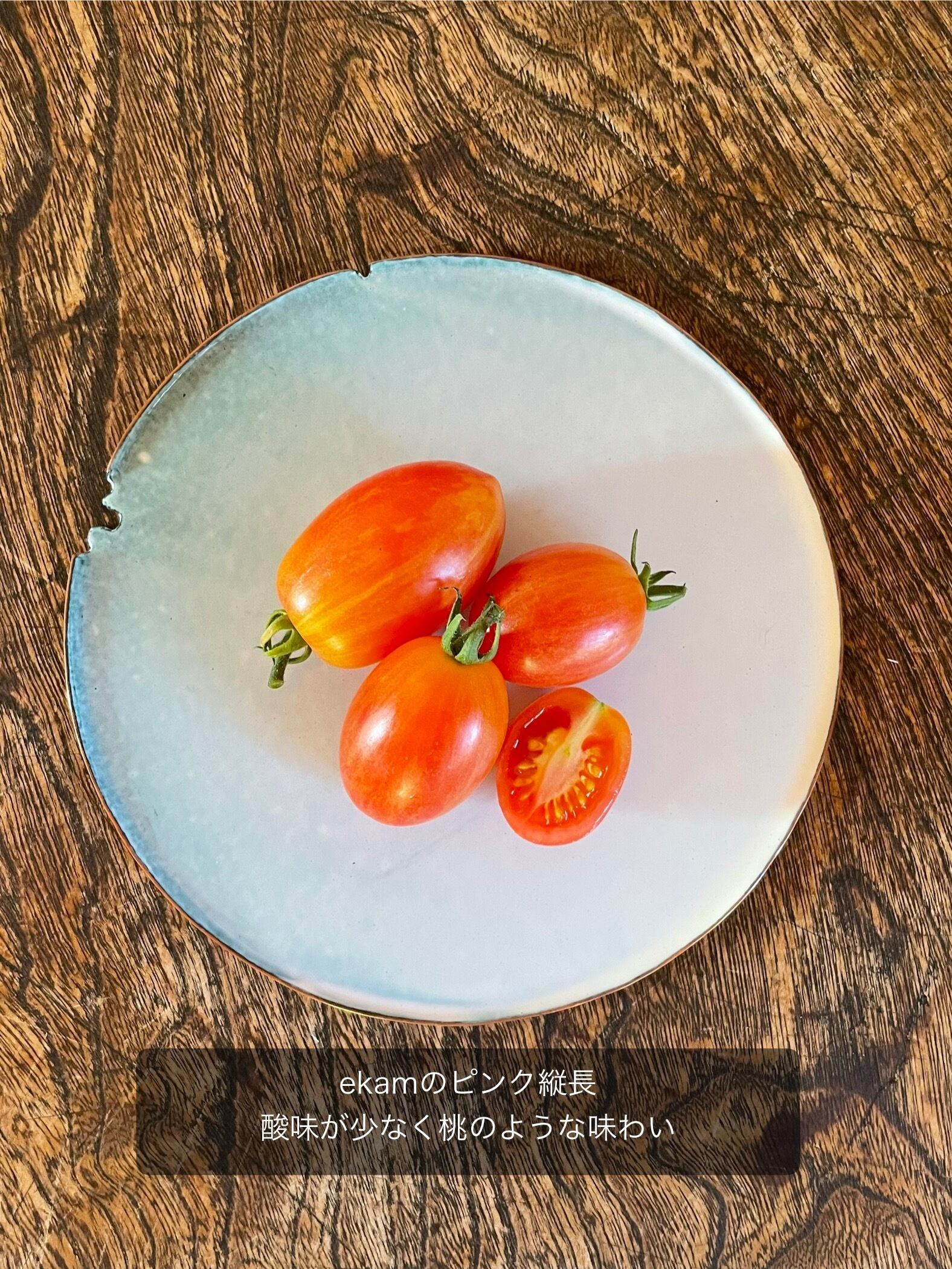 ピンク縦長:ekam内で自家採種を続けて5年目になり、新たに誕生しました。酸味が少なく桃のような味わいです。