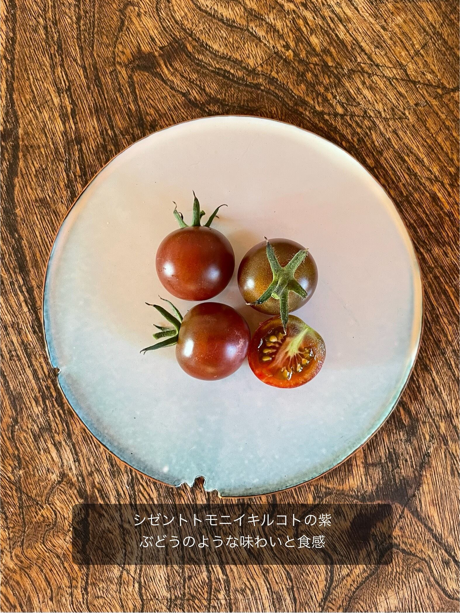 紫:シゼントトモニイキルコトから頂いた実から自家採種をしました。ぶどうのような味わいです。